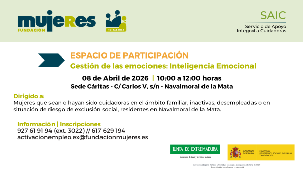 Dirigido a: Mujeres cuidadoras, ex cuidadoras y potenciales cuidadoras en el ámbito familiar, que estén en riesgo de desactivación o inactivas en general que llevan mucho tiempo apartadas del mercado laboral y de la participación social, residentes en Navalmoral de la Mata o alrededores.