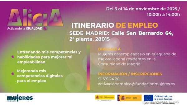 Si necesitas más información, llámanos al 91 591 24 20 (ext. 1028) o escríbenos a activacionempleo@fundacionmujeres.es