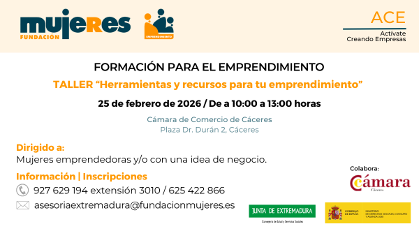 En colaboración con la Cámara de Comercio de Cáceres, ponemos en marcha un nuevo Taller de Motivación al Emprendimiento dirigido a mujeres que quieran dar el paso hacia la creación de su propio negocio.