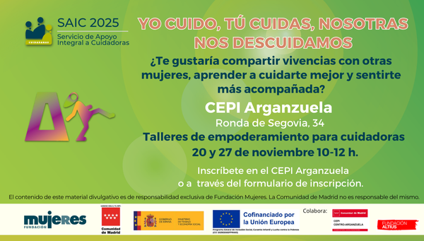 Si necesitas más información, llámanos al 91.591.24.20 (ext. 1022) o escríbenos a cuidadanas@fundacionmujeres.es