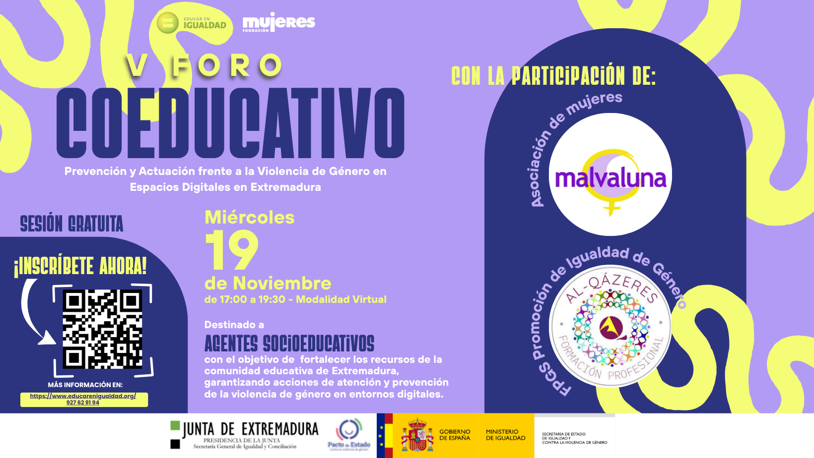 En el marco del proyecto Educar en Igualdad Extremadura 2025, Fundación Mujeres celebrará el próximo miércoles 19 de noviembre de 2025, de 17:00 a 19:30 horas, el V Foro Coeducativo de Extremadura, bajo el lema “Prevención y actuación frente a la violencia de género en espacios digitales”.