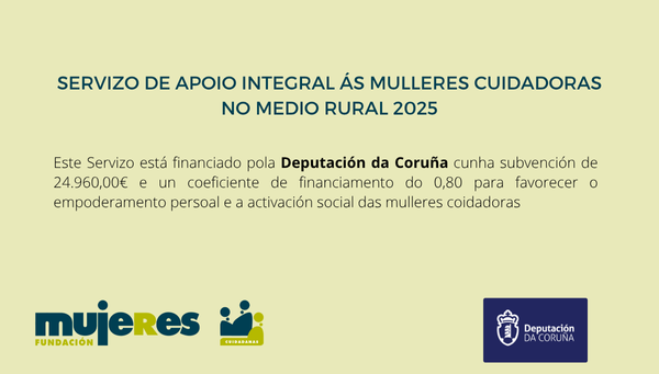 Fundación Mujeres desenvolve o Servizo de Apoio Integral a Coidadoras en varios municipios da contorna rural da provincia da Coruña, grazas ao cofinanzamento da Deputación da Coruña. Nel ofrecese un apoio integral as mulleres coidadoras de persoas en situación de dependencia no seu ámbito familiar, a través de diferentes accións encamiñadas a mellorar a saúde e a calidade de vida das coidadoras informais, axudándolles a minimizar as problemáticas derivadas das tarefas de coidado e reducindo así a súa vulnerabilidade ante o impacto de coidar.